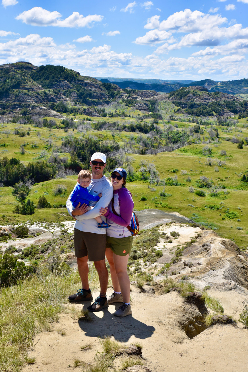 July 5 - After grabbing a quick coffee & homemade breakfast sandwich from the Medora C-Store, we made our way over to the Point to Point trailhead where we were greeted for a guided hike through the trails (Mornings on Town Butte). This 35m hike was filled with stunning views of Medora and featured facts about Theodore Roosevelt and his experiences in the area. After a somewhat strenuous hike, we opted for a scenic drive through TRNP while our little took a nap, where we spotted tons of wildlife, including a herd of wild horses (dream come true). We made our way over to Painted Canyon Visitor's Center to escape the rain, where we saw incredible panoramic views of the canyons! We grabbed lunch at Badland's Pizza & Saloon, now a buffet, and enjoyed endless slices outside to watch the horse-drawn carriages and listen to live music across the street in the Town Center. We took our toddler to the wooden Children's Park in Point to Point Park (a free kids play area) to burn off some energy before playing a round of mini golf at Little Bully Pulpit! Dinner was by far the best meal of the trip at Theodore's Room in the Rough Rider Hotel in town before checking in to Elkhorn Quarters for the remainder of the trip.